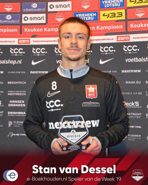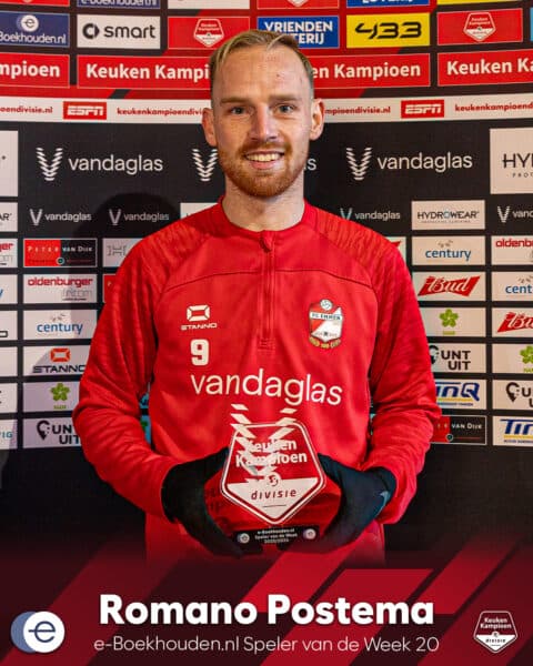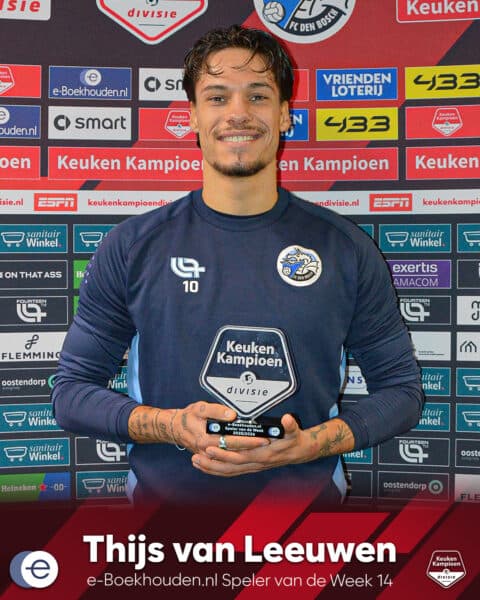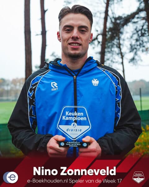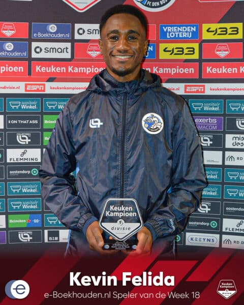 Op basis van statistieken bestaande uit o.a. goals, clean sheets, succesvolle dribbels, succesvolle passes etc. worden er drie spelers genomineerd voor de titel e-Boekhouden.nl Speler van de Week. Breng nu je stem uit en maak kans op twee wedstrijdtickets voor een Keuken Kampioen Divisie-wedstrijd. De speler met de meeste awards ontvangt de Wildcard voor Beste Speler van het seizoen!
